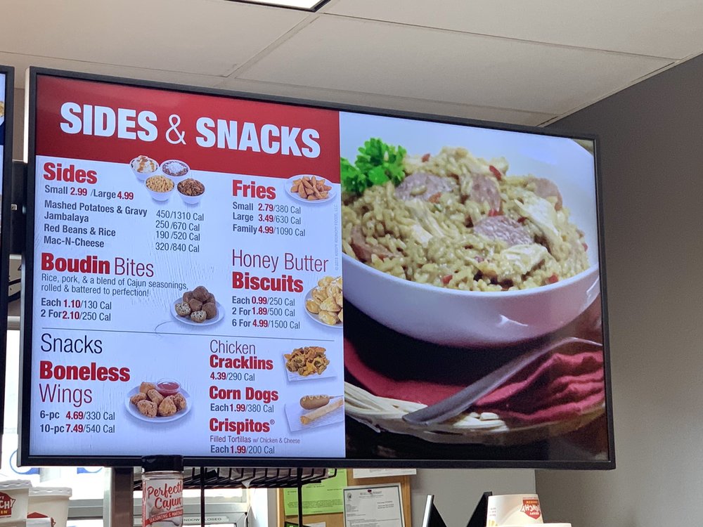Includes choice of hand-breaded, mildly Cajun-spiced fried chicken, regular side and a honey biscuit